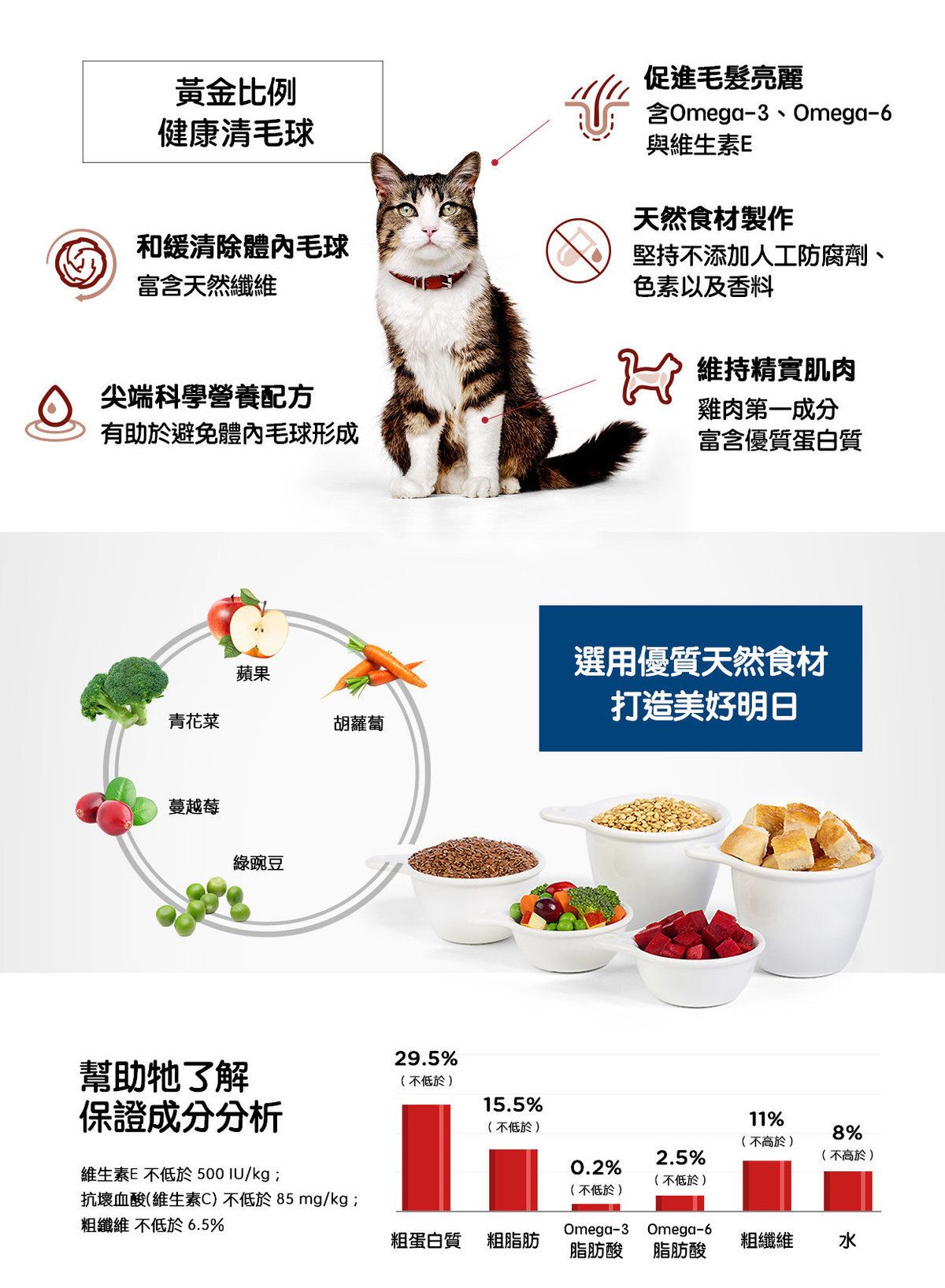 專為1至6歲成貓設計,高纖配方有效減少毛球形成並促進腸道蠕動,同時維持皮膚毛髮健康與理想體態。